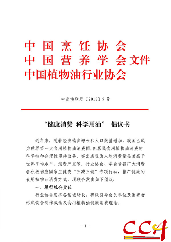 中国烹饪协会联合中国营养学会、中国植物油行业协会发布“健康消费 科学用油”倡议书