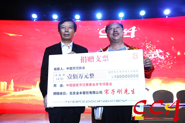 宋子刚总经理向姜俊贤会长捐赠100万元中国国家烹饪赛事金丰专项基金