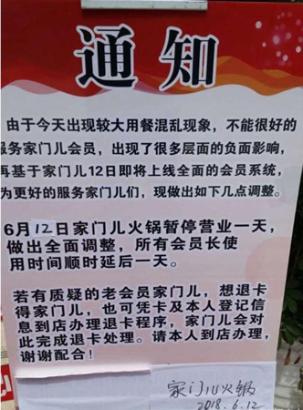 事发的火锅店名叫家门儿鲜菜火锅(下文简称“家门儿”),是在2017年12月底开业的,是几位大学好友一起合伙开的。家门儿开业半年,一直处于略亏损的状态,于是,他们就想到了办120元会员卡,吃一个月的火锅的吸粉活动。6月1号活动推出后,效果非常明显,会员卡被一抢而空,顾客络绎不绝,原本冷清的门店,变得异常热闹,甚至排起长队,但好景不长,就在活动推出的11天后,家门儿就无奈发布门店暂停歇业的通知。