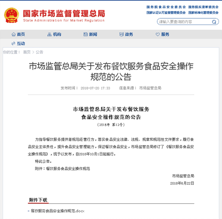 为指导餐饮服务提供者规范经营行为,落实食品安全法律、法规、规章和规范性文件要求,履行食品安全主体责任,提升食品安全管理能力,保证餐饮食品安全,7月20日国家市场监管总局网站正式发布了新修订的《餐饮服务食品安全操作规范》(以下简称“新《规范》”),新《规范》自2018年10月1日起施行。