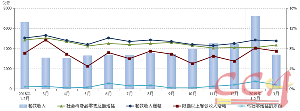 国家统计局4月17日发布今年一季度社会经济发展状况显示,2019年1-3月,全国餐饮收入10644亿元,同比增长9.6%;限额以上单位餐饮收入2226亿元,同比增长7.9%。其中,3月份,全国餐饮收入3393亿元,同比增长9.5%;限额以上单位餐饮收入726 亿元,同比增长7.5%。