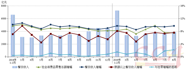 9月16日国家统计局最新发布的数据,2019年8月,全国餐饮收入3857亿元,同比增长9.7%;限额以上单位餐饮收入815亿元,同比增长7.6%。2019年1-8月,全国餐饮收入28795亿元,同比增长9.4%;限额以上单位餐饮收入6048亿元,同比增长7.3%。